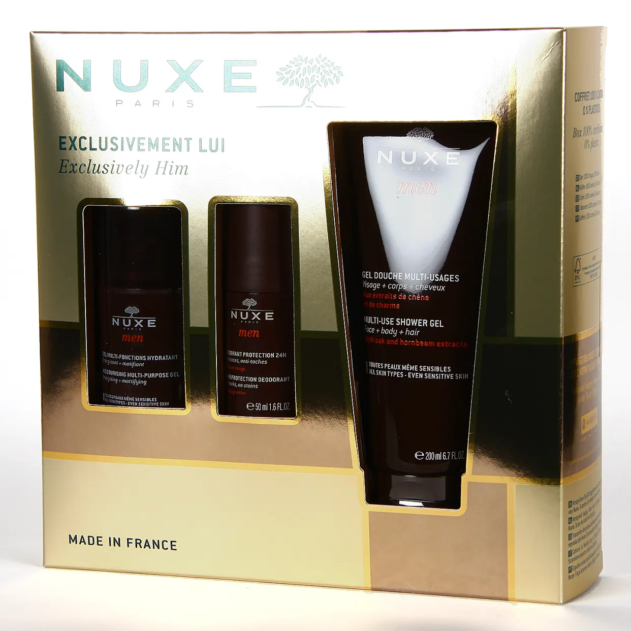 El Nuxe PACK Exclusivamente para él reúne lo esencial para el cuidado diario masculino: gel hidratante antimperfecciones, gel de ducha multiusos y desodorante 24 h. Texturas ligeras, piel fresca y cuidada con una fragancia amaderada elegante. Un regalo práctico y eficaz para hombres que quieren verse y sentirse bien cada día.